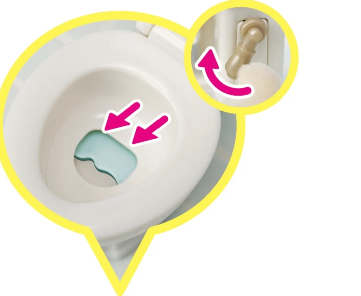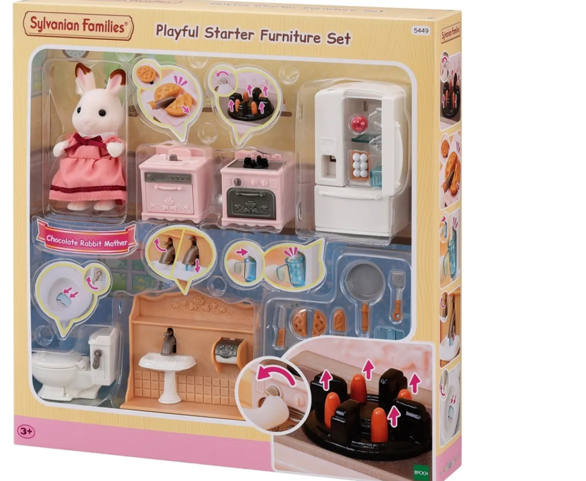 Sylvanian Families Playful Starter Furniture Set lets you turn the knob on the hob to reveal a flame. Place the apple pie or baguette on the cutting table and cut them with the knife. Place a cup in the fridge ice dispenser to make ice come out. Open the tap over the sink for “water” to come out. Pull the toilet handle to “flush”. Contents: A Chocolate Rabbit Mother, a cooker, a kitchen counter, a drawer, a fridge, a freezer compartment, a tray, a sink, a toilet, an apple pie halves, a baguette, a knife, a frying pan, a spatula, a pancake, flour, eggs, milk, an apple, 3 cups and ice.