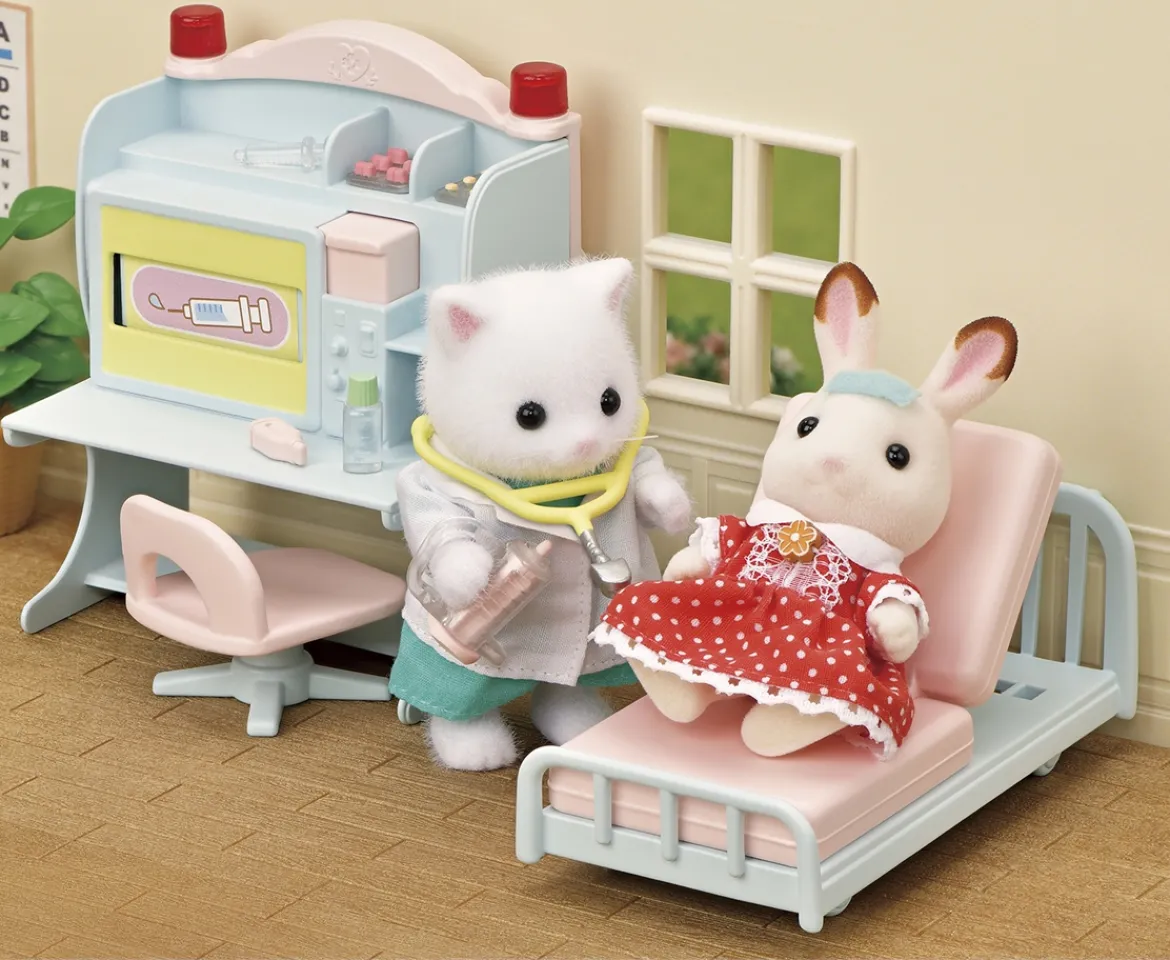 The Village Doctor Starter Set featuring everything you need to pretend playing doctor, including figure with white coat, check-up machine and other medical tools. Help keep healthy with the included syringes, stethoscope, bed, wheelchair, medicine and other accessories. The doctor’s bag can be used to store the syringes, stethoscope and medicine. The plaster cast can git onto child figures. Includes Persian Cat mother, Doctor Dawn.Combine with the Red Roof Cosy Cottage (sold separately) to turn the house into a doctor’s surgery! Combine with vehicle sets like the Family Picnic Van or Family Campervan (sold separately) to turn the cars into an ambulance!