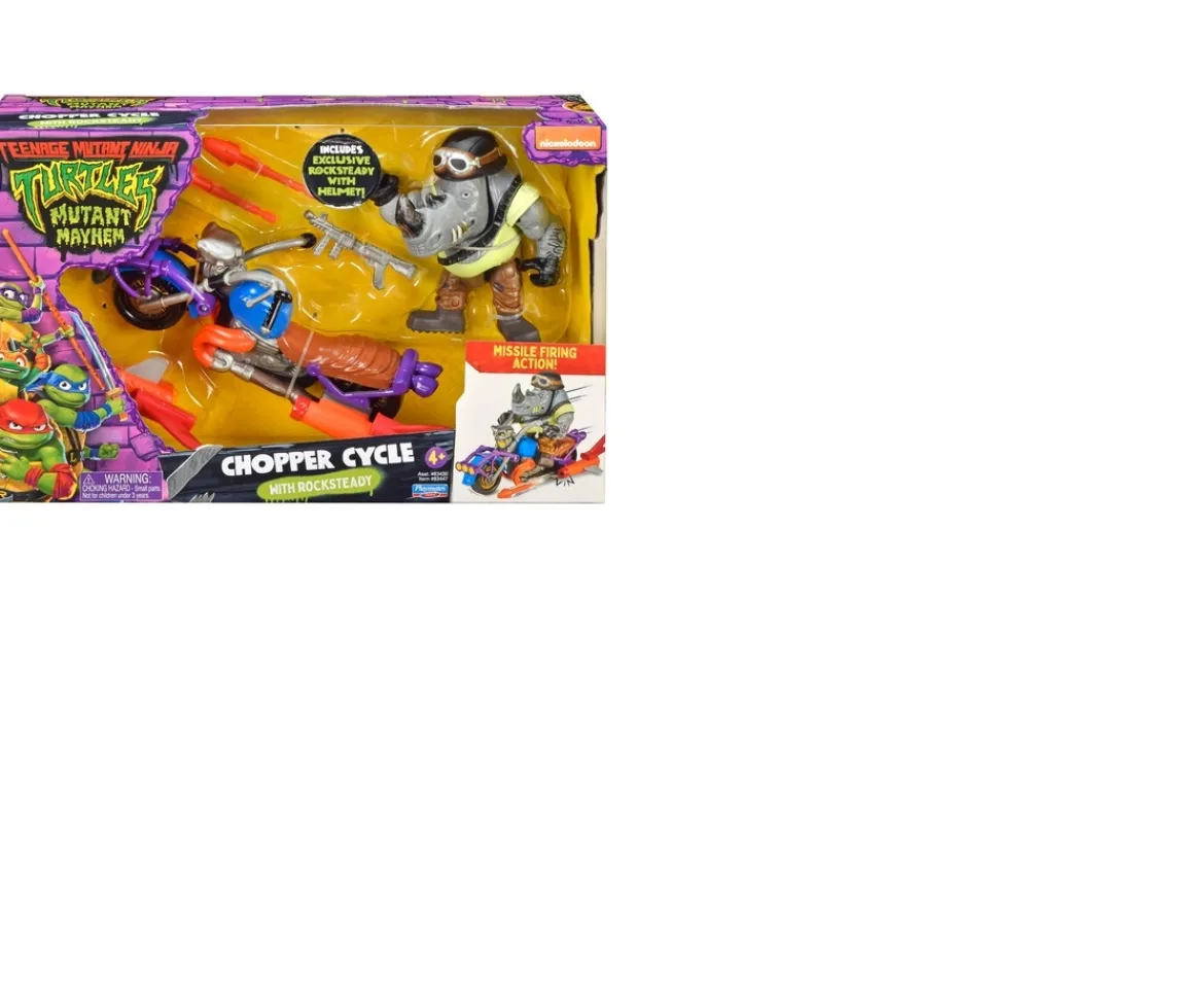 Get ready for the Mutant Mayhem figures and vehicles, based on the new CG animated Teenage Mutant Ninja Turtles film! When Superfly unleashes Mutant Mayhem in New York City, Rocksteady joins the fight on his Chopper Cycle!The cycle speeds down the city streets and Rocksteady launches into action! As the opponent approaches, Rocksteady presses the fin on the side of his Chopper Cycle to launch twin missiles in their direction. The baddie is quickly knocked down and knocked out!