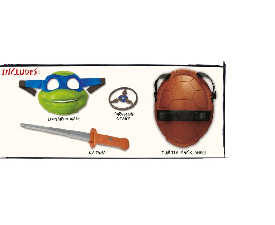 - Contents: 1x Leonardo Mask, 1x Throwing Star, 1x Hide N' Reveal Katana Sword & 1x Turtle Back Shell