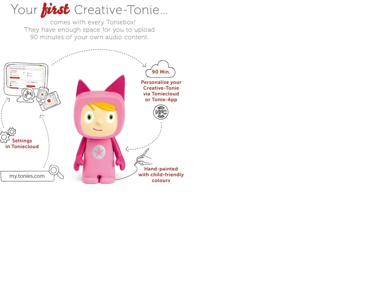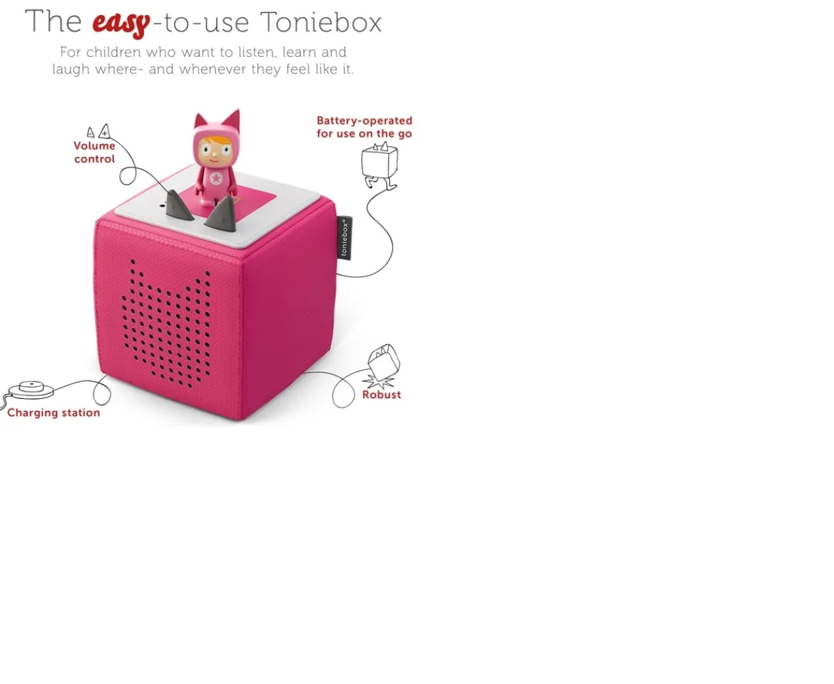 The Toniebox Starter Set is a new audio system for kids.Take music and bedtime stories wherever you go with cute characters, simple controls and no bright screens. Just place a Tonie on the speaker to start your audio adventure. Listen, sing or tell your very own story.How It WorksPlace a Tonie character on the speaker to play music and stories. When you pop a Tonie on for the first time, its story will download onto the Toniebox and start playing. Once a new Tonie is added, kids can play their story anywhere.Simple ControlsControls so simple, even 3-year-olds can use them. Tap the sides to switch tracks, take off the Tonie to stop and press the ears to change the volume. When you want to hear something else, just change Tonies to jump between audiobooks, music and stories. It’s that easy!Made for KidsSoftly padded with no hard edges, the Toniebox is tough enough for hands-on play. With up to 7 hours battery life and no WiFi needed, children will love listening to their favourite music and stories on the go. Toniebox goes to sleep when you do too. Once a bedtime story has finished, the speaker simply turns itself off.Loved by ParentsWelcome to screen-free play. Toniebox kids’ speakers replace bright, over-stimulating screens with simple tactile controls. Setting up is child’s play.Creative-TonieThe Toniebox Starter Set comes with a Creative-Tonie. This hand- painted figure has space for 90 minutes of your own music, audiobooks and kids’ voice recordings. If you’ve already got lots of audio you love, you can add it to your Creative-Tonie. Get creative and record your own stories and songs in the Tonie-App!ToniesReady-to-play Tonie figures comes pre-loaded with songs and bedtime stories from your favourite characters. These hand-painted figures are great for playtime on and off the Toniebox. Each sold separately.