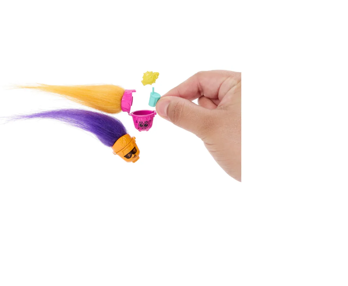 The DreamWorks Trolls™ Hair Pops™ small dolls are ready to pop out! This Branch doll features two Hair Pops™ that can fit in his plush hair and pop out with just a pinch. The adorable plush Hair Pops™ hide a surprise inside, too, and can hold different accessories as storage to switch up the action. With six pieces that include removable fashions, Hair Pops™ Branch doll is ready to create storylines that really pop! Doll cannot stand alone. Colors and decorations may vary.