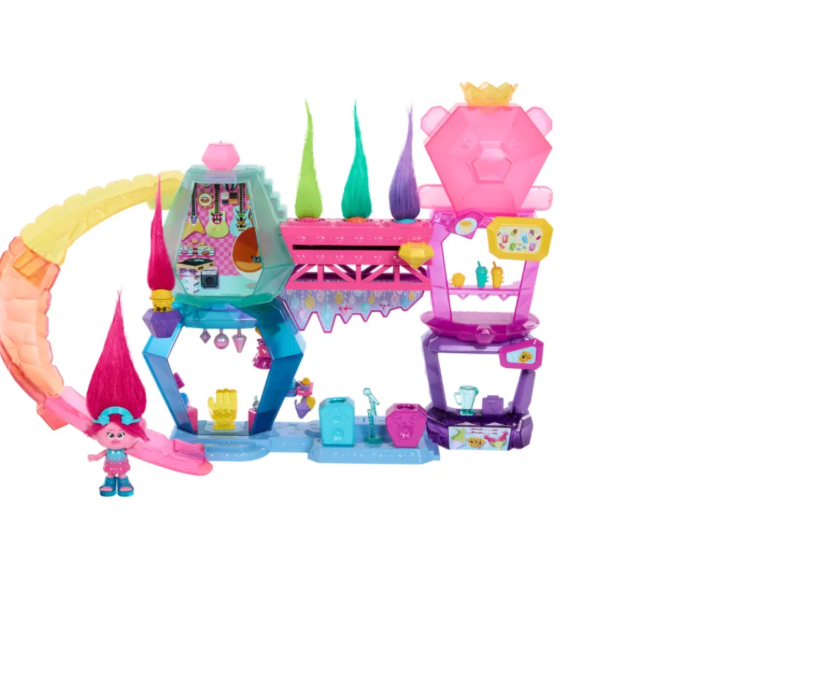 - Discover adventure with the DreamWorks Trolls™ Mount Rageous playset featuring Queen Poppy small doll! ?Inspired by the vibrant location from DreamWorks Trolls Band Together, the 2-story set features a slide, snack bar, dressing room, Hair Pops™ launcher, stage, and more! ?Kids can let their imaginations fly when they use the bridge launcher to send the 4 included Hair Pops™ into the air — slide the gem to see them go! ?Hair Pops™ can also be hidden within Poppy doll's plush hair — just pinch to pop them out for hair-raising fun! ?Hair Pops™ can open to hide and store different accessories!