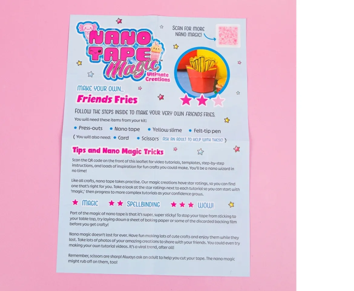 Unlock your creativity with the Nano Tape Magic craft set, perfect for crafting enthusiasts of all ages! This comprehensive kit includes 2 clear rolls, plus purple and yellow nano tape, along with essential supplies like felt markers, plastic straws, and press-out sheets for endless crafting possibilities.Transform your creations with kawaii animal charms, colorful sprinkles, and shaped sequins. The set also features ready-made slimes, a pump for bubble balloons, and various accessories like key chains and window suckers for displaying your finished projects!Create up to 10 unique crafts, from personalised key chains to window decals. This versatile set provides all you need for fun, imaginative play and artistic expression, just include scissors!
