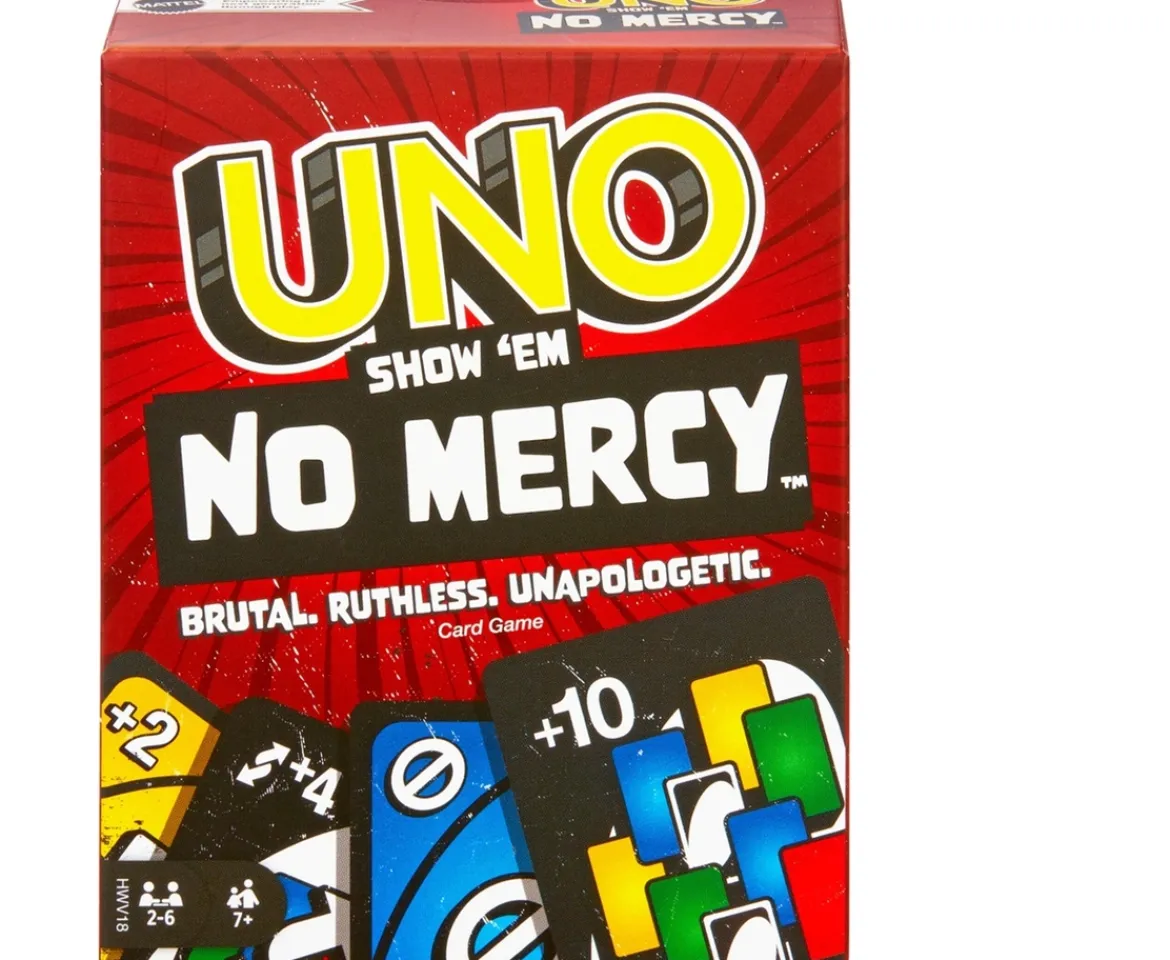 UNO Show ‘Em No Mercy is the most brutal UNO game yet. 56 more cards, special rules and super-tough action cards make this a brutal, ruthless & unapologetic experience for all involved!The extra cards have even tougher penalties (draw 10 cards anyone?) and new rules that will have players stacking, swapping and drawing more cards than ever before! And there’s even a Mercy Rule (yes, we get the irony) if things get too rough. There are two ways to win in this merciless version of the classic game: get rid of all cards or knock all other players out of the game! Oh – and if you manage to get down to one card, don’t forget to yell ‘UNO!’