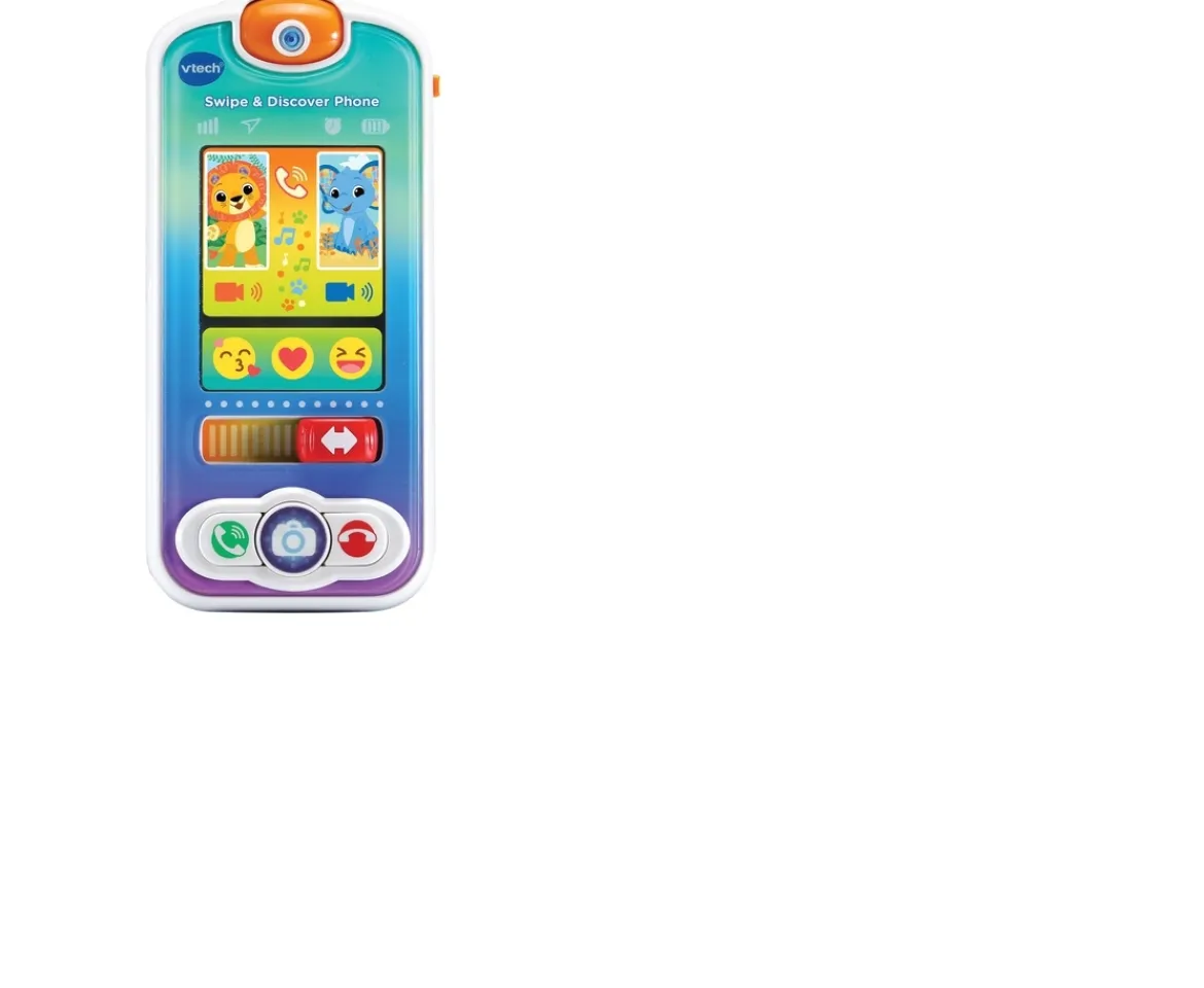 Introducing the Vtech Swipe & Discover Phone! Features 12 multicoloured light-up app icons for your little one to press and discover! The phone introduces babies to animals, numbers, weather, daily life role play and more!Adorable and fun phrases encourage little ones to interact and learn! Sliding the slider brings a whole new mode of play, so little one can have pretend phone and video calls with the animal friends! Includes 15 melodies, 4 sing-along songs and more!