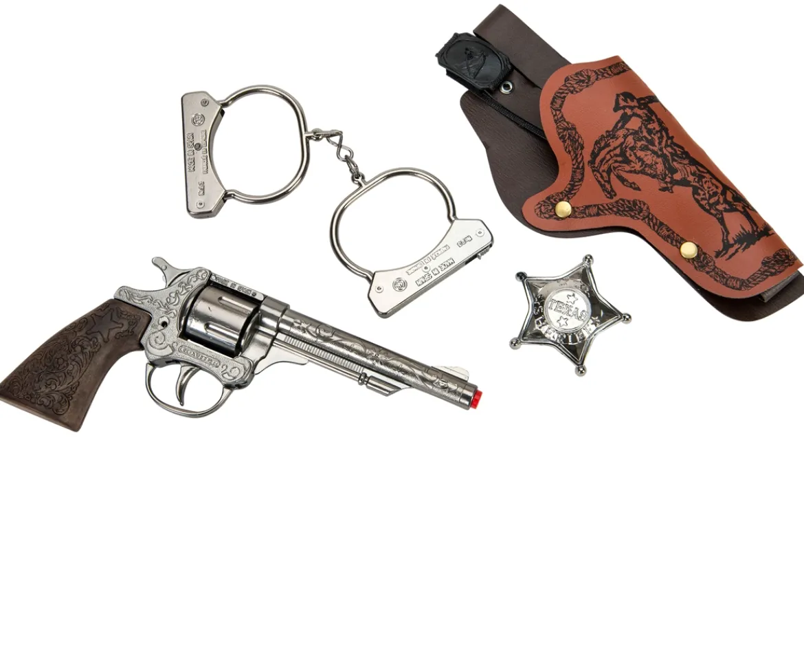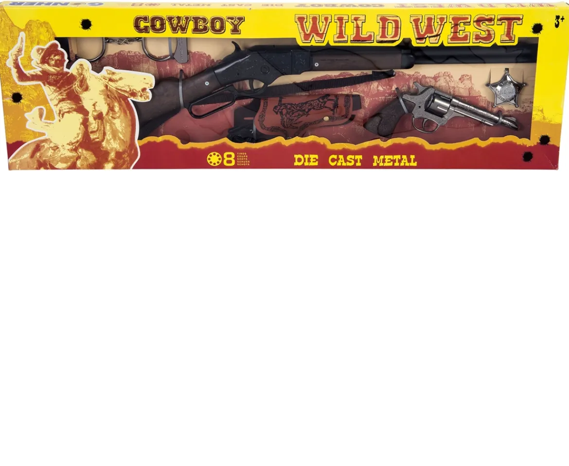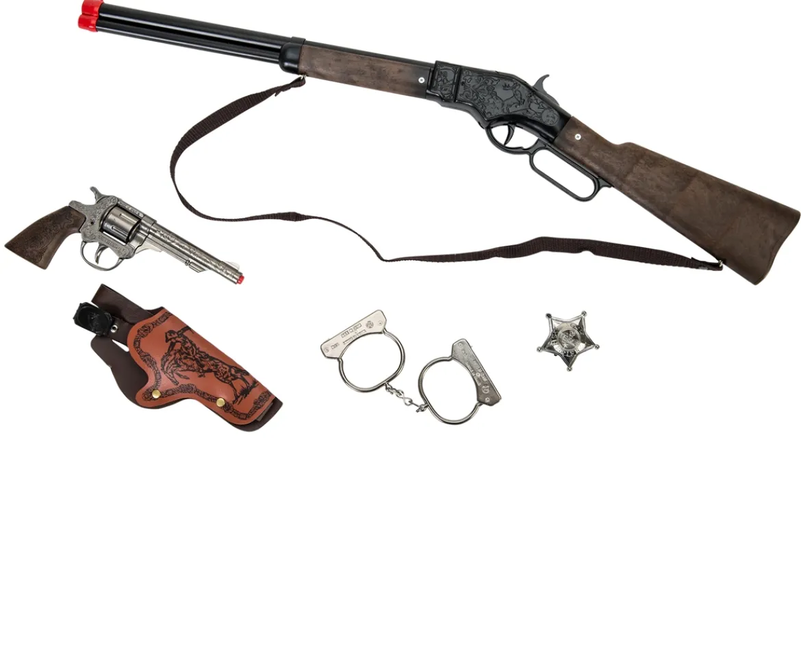 You are ready for action with this Gohner Wild West Play Set. As sheriff it is up to you to stop the cowboys from running wild. Use your rifle and gun to stop their shoot outs. Once you catch the trouble makers put them under arrest and use your handcuffs so they don’t try to escape.