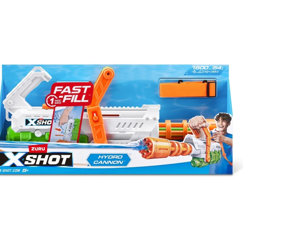- Contents: x1 X-Shot Fast-Fill Hydro Cannon water blaster, 1x blaster shoulder strap
